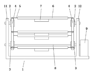 進(jìn)一步改進(jìn)的實(shí)施例,所述傳動(dòng)軸8的左右端分別固定連接在左、右側(cè)的下鏈輪3上。傳動(dòng)軸8設(shè)置在下鏈輪3上,便于電機(jī)9的安裝,此時(shí)的電機(jī)9可直接放置的底座1上。另外,所述底座1為鋁合金構(gòu)件。